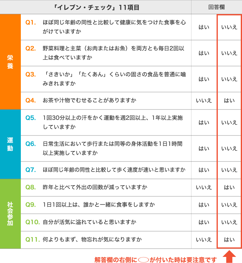フレイルは早期に発見・対応すれば健康な状態へと戻ることが可能です。上記の項目に当てはまらない場合であっても、次の11項目を定期的にチェックし、フレイルの軽微な兆候やリスク要因がないかどうか確認してみましょう。