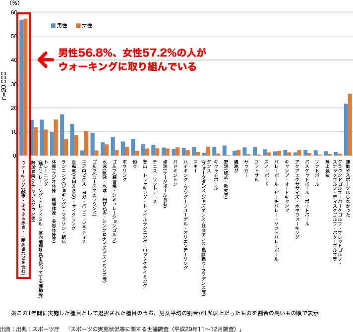 スポーツの実施状況等に関する世論調査(スポーツ庁:平成29年度調査)では、この1年間に実施した種目は「ウォーキング」がトップで、男性56.8%、女性57.2%と半分以上の人がウォーキングに取り組んでおり、年齢別では70代が70%以上取り組んでいます。