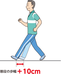 金先生の老年症候群の調査では、「歩容」が重要ということがわかりました。そこで、筋肉量維持のために金先生が提唱するのは、「普段の歩幅プラス10cm」ウォーキングです。歩幅が大きくなると自然にスピードが上がり、筋肉に刺激が与えられ、筋トレ効果が期待できます。歩いているうちに元の歩幅に戻ってしまっても、「歩幅プラス10cm」を思い出して歩き直しましょう。