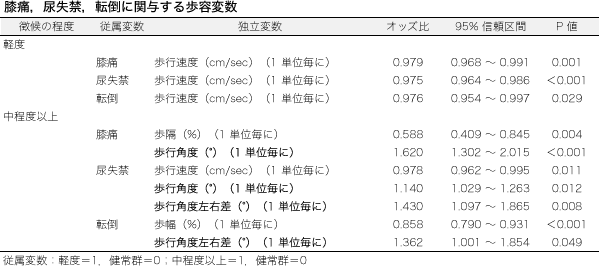 膝痛、尿失禁、転倒と歩行要因を比較した結果、いずれの症状でも軽度の場合では歩行速度の低下が、中程度以上の症状では歩容の変化が特徴づけられていることが確認できました。